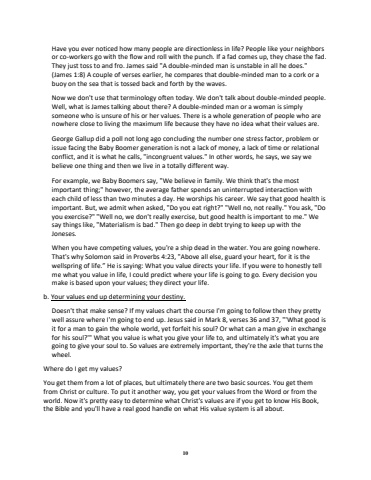 10Have you ever noticed how many people are directionless in life? People like your neighbors or co-workers go with the flow and roll with the punch. If a fad comes up, they chase the fad. They just toss to and fro. James said \(James 1:8) A couple of verses earlier, he compares that double-minded man to a cork or a buoy on the sea that is tossed back and forth by the waves.Now we don't use that terminology often today. We don't talk about double-minded people. Well, what is James talking about there? A double-minded man or a woman is simply someone who is unsure of his or her values. There is a whole generation of people whoare nowhere close to living the maximum life because they have no idea what their values are.George Gallup did a poll not long ago concluding the number one stress factor, problem or issue facing the Baby Boomer generation is not a lack of money, a lack of time or relational conflict, and it is what he calls, \believe one thing and then we live in a totally different way.For example, we Baby Boomers say, \important thing;\each child of less than two minutes a day. He worships his career. We say that good health is important. But, we admit when asked, \you exercise?\say things like, \Joneses.When you have competing values, you're a ship dead in the water. You are going nowhere. That's why Solomon said in Proverbs 4:23, \wellspring of life.%u201d He is saying: What you value directs your life. If you were to honestly tell me what you value in life, I could predict where your life is going to go. Every decision you make is based upon your values; they direct your life.b. Your values end up determining your destiny.Doesn't that make sense? If my values chart the course I'm going to follow then they pretty well assure where I'm going to end up. Jesus said in Mark 8, verses 36 and 37, \it for a man to gain the whole world, yet forfeit his soul? Or what can a man give in exchange for his soul?'\going to give your soul to. So values are extremely important, they're the axle that turns the wheel.Where do I get my values? You get them from a lot of places, but ultimately there are two basic sources. You get them from Christ or culture. To put it another way, you get your values from the Word or from the world. Now it's pretty easy to determine what Christ's values are if you get to know His Book, the Bible and you'll have a real good handle on what His value system is all about.