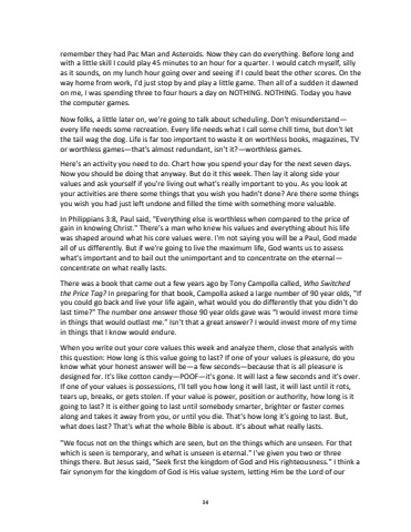 14remember they had Pac Man and Asteroids. Now they can do everything. Before long and with a little skill I could play 45 minutes to an hour for a quarter. I would catch myself, silly as it sounds, on my lunch hour going over and seeing if I could beat the other scores. On the way home from work, I'd just stop by and play a little game. Then all of a sudden it dawned on me, I was spending three to four hours a day on NOTHING. NOTHING. Today you have the computer games. Now folks, a little later on, we're going to talk about scheduling. Don't misunderstand%u2014every life needs some recreation. Every life needs what I call some chill time, but don't let the tail wag the dog. Life is far too important to waste it on worthless books, magazines, TV or worthless games%u2014that's almost redundant, isn't it?%u2014worthless games.Here's an activity you need to do. Chart how you spend your day for the next seven days. Now you should be doing that anyway. But do it this week. Then lay it along side your values and ask yourself if you're living out what's really important to you. As you look at your activities are there some things that you wish you hadn't done? Are there some things you wish you had just left undone and filled the time with something more valuable. In Philippians 3:8, Paul said, \gain in knowing Christ.\was shaped around what his core values were. I'm not saying you will be a Paul, God made all of us differently. But if we're going to live the maximum life, God wants us to assess what's important and to bail out the unimportant and to concentrate on the eternal%u2014concentrate on what really lasts.There was a book that came out a few years ago by Tony Campolla called, Who Switched the Price Tag?In preparing for that book, Campolla asked a large number of 90 year olds, \you could go back and live your life again, what would you do differently that you didn't do last time?\in things that would outlast me.%u201d Isn't that a great answer? I would invest more of my time in things that I know would endure.When you write out your core values this week and analyze them, close that analysis with this question: How long is this value going to last? If one of your values is pleasure, do you know what your honest answer will be%u2014a few seconds%u2014because that is all pleasure is designed for. It's like cotton candy%u2014POOF%u2014it's gone. It will last a few seconds and it's over. If one of your values is possessions, I'll tell you how long it will last, it will last until it rots, tears up, breaks, or gets stolen. If your valueis power, position or authority, how long is it going to last? It is either going to last until somebody smarter, brighter or faster comes along and takes it away from you, or until you die. That's how long it's going to last. But, what does last? That's what the whole Bible is about. It's about what really lasts.\ focus not on the things which are seen, but on the things which are unseen. For that which is seen is temporary, and what is unseen is eternal.\things there. But Jesus said, \fair synonym for the kingdom of God is His value system, letting Him be the Lord of our