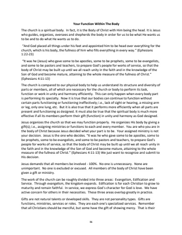 16Your Function Within The BodyThe church is a spiritual body. In fact, it is the Body of Christ with Him being the head. It is Jesus who guides, organizes, oversees and shepherds the body in order for us to be what He wants us to be and to do what He wants us to do. %u201cAnd God placed all things under his feet and appointed him to be head over everything for the church, which is his body, the fullness of him who fills everything in every way.%u201d (Ephesians 1:22-23)%u201cIt was he (Jesus) who gave some to be apostles, some to be prophets, some to be evangelists, and some to be pastors and teachers, to prepare God's people for works of service, so that the body of Christ may be built up until we all reach unity in the faith and in the knowledge of the Son of God and become mature, attaining to the whole measure of the fullness of Christ.%u201d (Ephesians 4:1113)The church is compared to our physical body to help us understand its structure and diversity of parts or members, all of which are necessary for the church or body to perform its task, function or work in unity and harmony efficiently. This can only happen when every body part is performing its specialty. Now it is true that our bodies can continue to function without certain parts functioning or functioning ineffectively; i.e., lack of sight or hearing, a missing arm or leg, only one lung, etc. But it is also true that it performs more efficiently when all parts are present and functioning as designed. It must also be true that the spiritual body is much more effective if all its members perform their gift (function) in unity and harmony as God designed. Jesus organizes the church so that we may function properly. He organizes His body by giving a gift(s); i.e., assigning ministries or functions to each and every member. You are who you are in the body of Christ because Jesus decided what your part is tobe. Your assigned ministry is not your decision. Jesus is the one who decides. %u201cIt was he who gave some to be apostles, some to be prophets, some to be evangelists, and some to be pastors and teachers, to prepare God's people for works of service, so that the body of Christ may be built up until we all reach unity in the faith and in the knowledge of the Son of God and become mature, attaining to the whole measure of the fullness of Christ.%u201d (Ephesians 4:11-13) We just want to recognize and submit to Hisdecision.Jesus demands that all members be involved -100%. No one is unnecessary. None are unimportant. No one is excluded or excused. All members of the body of Christ have been given a gift or ministry. The work of the church can be roughly divided into three areas: Evangelism, Edification and Service. Through evangelism, the kingdom expands. Edification is for each Christian to grow to maturity and remain faithful. In service, we express God's character for God is love. We have active concern for others in their necessities. These three areas overlap greatly in practice.Gifts are not natural talents or developed skills. They are not personality types. Gifts are functions, ministries, services or roles. They are each one's specialized services. Remember that all Christians should be merciful, but some have the gift of showing mercy. That is their