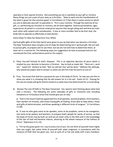 17specialty or their special ministry. Not everything you do is classified as your gift or ministry. Many things are just a part of your duty as a Christian. %u201cNow to each one the manifestation of the Spirit is given for the common good. (1 Corinthians 12:7) But there is some service to which you are to dedicate yourself, to specialize in. This is your ministry. Through the exercise of our gift, i.e. performing our function or ministry, we all work together. Diverse personalities, ages, experiences all joined in a common enterprise requires that we get along well and that we treat each other with respect and consideration. If one or more member fails to do their task, the body fails to operate as effectively as God desires. Some Steps To Help You Determine Your Gift(s)Spiritual gifts (gifts of the Holy Spirit) were given to you by God when you became a Christian. The New Testament does not give a list of steps for determining one%u2019s spiritual gift. We are told to pursue gifts, to prepare and to use them, but we are not told how to determine them, at least not in a concise list. The following steps are suggestions on how to proceed and are not considered the final, authoritative word on the subject. 1.Place Yourself Entirely At God's Disposal: This is an objective decision of yours which is implied by your decision to become a Christian. Say to God as Isaiah did: \me.\why would we expect God to answer us when we ask Him how He wants to use us?2.Pray: You know that God has a purpose for you in the body of Christ. So now you ask Him to show you what it is, knowing that He will answer for it is His will. Psalm 25:12. Praying for this we are simply asking for God to reveal to us what Jesus has determined for us to be doing.3.Review The Lists Of Gifts In The New Testament: You need to start thinking about what God calls a ministry. The following are some examples of gifts or ministries (not including temporary or miraculous ones) that should give you an idea. a.%u201cAnd in the church God has appointed first of all apostles, second prophets, third teachers, then workers of miracles, also those having gifts of healing, those able to help others, those with gifts of administration, and those speaking in different kinds of tongues.%u201d (1 Corinthians 12:28)b.%u201cIt was he who gave some to be apostles, some to be prophets, some to be evangelists, and some to be pastors and teachers, to prepare God's people for works of service, so that the body of Christ may be built up until we all reach unity in the faith and inthe knowledge of the Son of God and become mature, attaining to the whole measure of the fullness of Christ.%u201d (Ephesians 4:11-13)c.%u201cFor by the grace given me I say to every one of you: Do not think of yourself more highly than you ought, but rather think of yourself with sober judgment, in accordance with the measure of faith God has given you. Just as each of us has one body with many members,