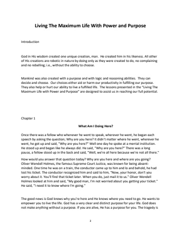 2Living The Maximum Life With Power and PurposeIntroductionGod in His wisdom created one unique creation, man. He created him in his likeness. All other of His creations are robotic in nature by doing only as they were created to do, no complaining and no rebelling; i.e., without the ability to choose. Mankind was also created with a purpose and with logic and reasoning abilities. They can decide and choose. Our choices either aid or harm our productivity in fulfilling our purpose. They also help or hurt our ability to live a fulfilled life. The lessons presented in the %u201cLiving The Maximum Life with Power and Purpose%u201d are designed to assist us in reaching our full potential.Chapter 1 What Am I Doing Here? Once there was a fellow who whenever he went to speak, wherever he went, he began each speech by asking the question; Why are you here? It didn't matter where he went, wherever he went, he got up and said, \He stood up and began like he always did. He said, \pause, a fellow stood up in the back and said, \How would you answer that question today? Why are you here and where are you going? Oliver Wendell Holmes, the famous Supreme Court Justice, was known for being absentminded. One time he was on a train, the conductor came up to him and lo and behold, he had lost his ticket. The conductor recognized him and said to him, \worry about it. You'll find that ticket later. When you do, just mail it to us.\Holmes looked at him and said, \He said, \The good news is God knows why you're here and He knows where you need to go. He wants to empower you to live the life. God has a very clear and distinct purpose for your life. God does not make anything without a purpose. If you are alive, He has a purpose for you. The tragedy is
