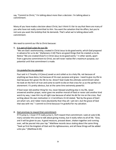 21say, \commitment.Many of you have made a decision about Christ, but I think it's fair to say that there are many of you who have not really committed to Him. You want the salvation that He offers, but you're not sure you want the lordship that He demands. That's what we'retalking about with commitment.We need to commit our life to Christ because:1.It is part of God's plan for our life.\ are God's workmanship, created in Christ Jesus to do good works, which God prepared in advance for us to do.\Notice \from a genuine commitment to Christ, we will never realize life%u2019s maximum purpose, our potential until that commitment is made.I'm grateful for my salvation. Paul said in 2 Timothy 1:9 [Jesus] saved us and called us to a holy life, not because of anything we have done, but because of His own purpose and grace. I need to give my life to God because He's given His life to me. Amen? God made the ultimate commitment when He took on the form of man and came to earth to die on that cross for us as the perfect sin atonement. It's pretty obvious, but at the same time extremely powerful.If God never did another thing for me, never blessed anything else in my life, never answered another prayer, never gave me another morsel of food or never said another kind word my way, I owe Him my all right now because of what He did for me on the cross. Paul writing about His own motivation in 1 Corinthians 15:10 stated, \am what I am, and I labor more abundantly than they all%u2014yet not I, but the grace of God that was with me.\2.God promises to reward that commitment.If I'll jump in, I mean if I'll really jump in, He'll reward that commitment. Look at Luke 6:38, many consider this verse to talk about giving money, but it really refers to all of life. \and it will be given to you. A good measure, pressed down, shaken together and running over, will be poured into your lap.\\ ye first the kingdom of God and His righteousness, and all these things will be added unto you.\