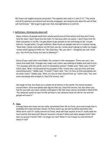 23But there are heights beyond computers. The apostle John said in 1 John 2:17, \and all its passions and desires will one day disappear, but anyone who does the will of God will live forever.\2. Selfishness -thinking only about self.Many millions of people build their whole world around themselves and they don't have time for God. I don't have time for God; I'm too busy with my career. I don't have time for God's purposes in my life, I've got places to go, people to see and things to do. I've got dreams, I've got plans, I've got ambition. Now these are people who are in essence saying, \ God, I know more about my life than you do. I know what's going to make me happy, I know what's going to fulfill me.\you. You think you know, but you're blowing it.\Some of you read Calvin and Hobbs,the cartoon in the newspaper. There was one I saw some time back that I thought was really cute. Calvin was looking at Hobbs and said to him, \ at peace with the world, and I'm completely serene.\Calvin said, \everything exists.\do what I want.\once everybody else accepts it, they'll be serene, too.\We laugh at that, but there are a whole lot of Calvins in the world. The world revolves around them. Once everybody else figures that out, they'll be serene, too. But when you live for yourself, you have a pretty small goal in life. But Jesus said as recorded in Mark 8:35, \ whoever wants to save his life will lose it, but whoever loses his life for me and the gospel will save it.\3.Fear.Among those who have not yet really committed their life to Christ, pure and simple fear is probably the most common reason. As fears come up, we ask ourselves questions like: What will it cost? If I really commit to Christ, what will God require of me if I really took His hand and let Him lead me? Would I become afanatic? What will other people think? Will I lose my secular friends? Will I no longer be cool? What if I can't keep my commitment? What if I fail?