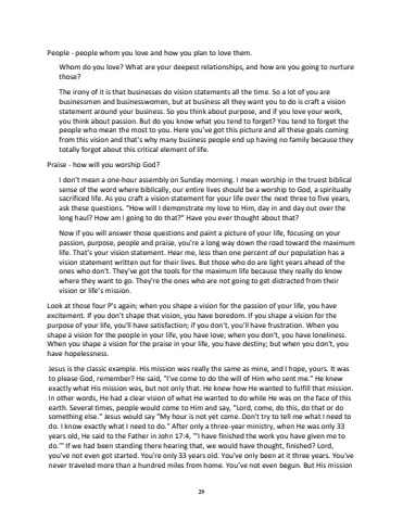 29Peoplepeople whom you love and how you plan to love them. Whom do you love? What are your deepest relationships, and how are you going to nurture those?The irony of it is that businesses do vision statements all the time. So a lot of you are businessmen and businesswomen, but at business all they want you to do is craft a vision statement around your business. So you think about purpose, and if you love your work, you think about passion. But do you know what you tend to forget? You tend to forget the people who mean the most to you. Here you've got this picture and all these goals coming from this vision and that's why many business people end up having no family because they totally forgot about this critical element of life.Praise-how will you worship God? I don't mean a onehour assembly on Sunday morning. I mean worship in the truest biblical sense of the word where biblically, our entire lives should be a worship to God, a spiritually sacrificed life. As you craft a vision statement for your life over thenext three to five years, ask these questions. %u201cHow will I demonstrate my love to Him, day in and day out over the long haul? How am I going to do that?%u201d Have you ever thought about that? Now if you will answer those questions and paint a picture of your life, focusing on your passion, purpose, people and praise, you're a long way down the road toward the maximum life. That's your vision statement. Hear me, less than one percent of our population has a vision statement written out for their lives. But those who do are light years ahead of the ones who don't. They've got the tools for the maximum life because they really do know where they want to go. They're the ones who are not going to getdistracted from their vision or life%u2019s mission.Look at those four P's again; when you shape a vision for the passion of your life, you have excitement. If you don't shape that vision, you have boredom. If you shape a vision for the purpose of your life, you'll have satisfaction; if you don't, you%u2019ll have frustration. When you shape a vision for the people in your life, you have love; when you don't, you have loneliness. When you shape a vision for the praise in your life, you have destiny; but when you don't, you have hopelessness.Jesus is the classic example. His mission was really the same as mine, and I hope, yours. It was to please God, remember? He said, \exactly what His mission was, but not only that. He knew how He wantedto fulfill that mission. In other words, He had a clear vision of what He wanted to do while He was on the face of this earth. Several times, people would come to Him and say, \something else.\do. I know exactly what I need to do.\years old, He said to the Father in John 17:4, '\do.'\you've not even got started. You're only 33 years old. You've only been at it three years. You've never traveled more than a hundred miles from home. You%u2019ve not even begun. But His mission