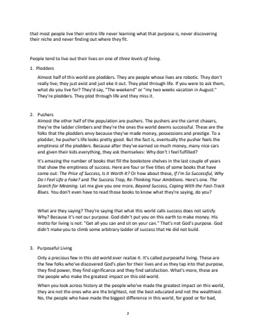 3that most people live their entire life never learning what that purpose is, never discovering their niche and never finding out where they fit.People tend to live out their lives on one of three levels of living. 1. PloddersAlmost half of this world are plodders.They are people whose lives are robotic. They don't really live; they just exist and just eke it out. They plod through life. If you were to ask them, what do you live for? They'd say, \They're plodders. They plod through life and they miss it.2.PushersAlmost the other half of the population are pushers.The pushers are the carrot chasers, they're the ladder climbers and they're the ones the world deems successful. These are the folks that the plodders envy because they've made money, possessions and prestige. To a plodder, he pusher's life looks pretty good. But the fact is, eventually the pusher feels the emptiness of the plodders. Because after they've earned so much money, many nice cars and given their kids everything, they ask themselves: Why don't I feel fulfilled?It's amazing the number of books that fill the bookstore shelves in the last couple of years that show the emptiness of success. Here are four or five titles of some books that have come out: The Price of Success, Is it Worth It?Or how about these, If I'm So Successful, Why Do I Feel Life a Fake? andThe Success Trap, ReThinking Your Ambitions. Here's one.The Search for Meaning.Let me give you one more, Beyond Success, Coping With the Fast-Track Blues.You don't even have to read those books to know what they're saying, do you?What are they saying? They're saying that what this world calls success does not satisfy. Why? Because it's not our purpose. God didn't put you on this earth to make money. His motto for living is not: \didn't make you to climb some arbitrary ladder of success that He did not build.3. Purposeful LivingOnly a precious few in this old world ever realize it. It's called purposeful living.These are the few folks who've discovered God's plan for their lives and as they tap into that purpose, they find power, they find significance and they find satisfaction. What's more, these are the people who make the greatest impact on this old world.When you look across history at the people who've made the greatest impact on this world, they are not the ones who are the brightest, not the best educated and not the wealthiest. No, the people who have made the biggest difference in this world, for goodor for bad,