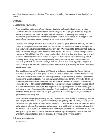 30and His vision were clear in His mind. They were not set by other people. Yours shouldn't be either.Craft Goals1. Goals reveal your vision. From the vision statement of your life, you begin to craft goals. Goals simply are the statement of faith to accomplish your vision. They are the steps you must take to get to where you want to go. Goals take you to your vision and in so doing they help you accomplish your life mission. I know most of you are not accustomed to setting goals and some of you may even have a theological persuasion against them.I believe with all my heart that God wants all of us to set goals. Some of you say, \rather presumptive. Didn't Jesus teach in the Sermon on the Mount, 'take no thought for tomorrow%u2019? Didn%u2019t James say that we shouldn't say, \if the Lord wills?\tomorrow.\the New International Version, \planning. He's talking about fretting or being overly concerned. He's talking about an insecure spirit that sits around and says, \me?\about tomorrow.The teaching of James \remind us that any vision and goals we strive for should seek God's wisdom for its success; otherwise failure will be under His sovereign power. Scripture clearly, CLEARLY, points out the need for vision and goals. \discerning man keeps wisdom in view, but a fool's eyes wander to the ends of the earth.\(Proverbs 17:24) Do you see what that says? That says when you fail to plan you just go off in a bunch of different directions. You've got to have a game plan in life. Otherwise, you're just going to react from one crisis to another. You're going to be blown from one problem to another. Without vision and without goals, you're not controlling your life, you're life is going to be controlling you.Jesus commended proper planning. In Luke 14 when Jesus was trying to encourage \be\He said, you've got to count the cost, you've got to think ahead. In verse 28, He said, what man for example would build a tower without first counting up his money and looking at his inventory of supplies? He wouldn't try to build that tower without knowing he could finish. Or in verse 31, he said, a king won't go to war in a battle unless he knows he's got enough troops to do the job. Well-formed goals help us achieve a vision. They're good, they're necessary.2. Criteria for good goalsa. Relevant