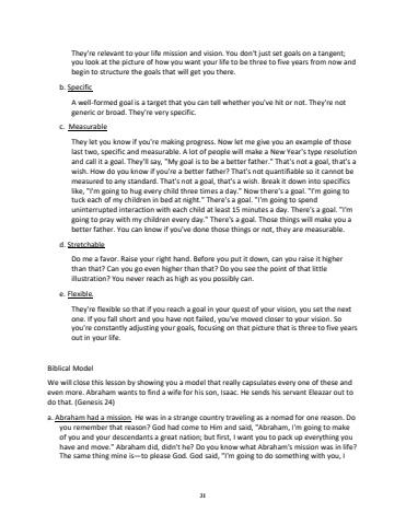 31They're relevant to your life mission and vision. You don't just set goals on a tangent; you look at the picture of how you want your life to be three to five years from now and begin to structure the goals that will get you there. b. SpecificA well-formed goal is a target that you can tell whether you've hit or not. They're not generic or broad. They're very specific. c. MeasurableThey letyou know if you're making progress. Now let me give you an example of those last two, specific and measurable. A lot of people will make a New Year's type resolution and call it a goal. They'll say, \wish. How do you know if you're a better father? That's not quantifiable so it cannot be measured to any standard. That's not a goal, that's a wish. Break it down into specifics like, \tuck each of my children in bed at night.%uninterrupted interaction with each child at least 15 minutes a day. There's a goal. \going to pray with my children every day.\better father. You can know if you've done those things or not, they are measurable. d. StretchableDo me a favor. Raise your right hand. Before you put it down, can you raise it higher than that? Can you go even higher than that? Do you see the point of that little illustration? You never reach as high as you possibly can.e. Flexible.They're flexible so that if you reach a goal in your quest of your vision, you set the next one. If you fall short and you have not failed, you've moved closer to your vision. So you're constantly adjusting your goals, focusing on that picture that is three to five years out in your life.Biblical Model We will close this lesson by showing you a model that really capsulates every one of these and even more. Abraham wants to find a wife for his son, Isaac. He sends his servant Eleazar out to do that. (Genesis 24)a. Abraham had a mission. He was in a strange country traveling as a nomad for one reason. Do you remember that reason? God had come to Him and said, \of you and your descendants a great nation; but first, I want you to pack up everything you have and move.\The same thing mine is%u2014to please God. God said, \