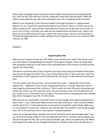 34Some of you are going to want to jump to those problems that you know are already facing you. Don't do that. Stay with your mission, shape your vision and craft your goals. While you work on those goals for your life, God is working on you. He is changing you for the better. Where is your life going? Is your life even headed in the right direction? Is it going toward heaven? Is it on a road that's paved by the blood of Jesus Christ? There is no other way to the Father except by Him. Have you been distracted and need to turn toget back on the road? If you're not in Christ, a Christian, you really are not headed where you want to go. Today is the day to put your faith and trust in Jesus, confess the name of Jesus, die to sin and be buried in His blood through Immersion in watercalling on Him to forgive you of your sins. Lesson # 1300 February 16, 1997Chapter 6 Organizing My TimeWhat are you trying to do with your life? What is your mission, your vision? How do you want your life to look in accomplishing that mission? You've got to set goals. Goals are those steps that are going to lead you to the vision in the accomplishment of the mission and they must be specific and measurable. This lesson is primarily about how to organize your day-to-day living to accomplish those goals. How do you manage your time? Time is your most precious asset. In fact, your time is your life. So obviously if you're going to live the maximum life, you've got to make maximum use of your time.\ very careful, then how you live%u2014not as unwise but as wise... making the most of every opportunity...\every opportunity because time is precious.%unlike your money, you can't save your time. You can't borrow it, buy it or manufacture it. All you can do is use it. If you don't use it, it's gone. If you don't learn to manage your time, nothing else will be managed in your life. It's that critical.How many of you would admit %u201cI just don't seem to have enough time to get everything done I want to do%u201d? I saw a Calvin and Hobbscartoon that I got a kick out of. Calvin turned to Hobbs, and he said to him, \I'm so far behind, I'll never die.\time. No! To the contrary, time in many senses is the great equalizer.Unless the world ends today, virtually every one of us will live all the way through today. If you live all the way through today, it is the one thing that you have in common with everybody else who lives through the day. You're not of equal strength, age,money or opportunity. But there's one thing all of us who will live through the day have in common, each one of us will have 24
