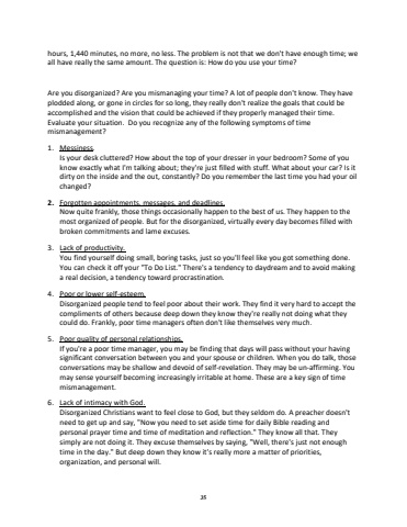 35hours, 1,440 minutes, no more, no less. The problem is not that we don't have enough time; we all have really the same amount. The question is: How do you use your time?Are you disorganized? Are you mismanaging your time? A lot of people don't know. They have plodded along, or gone in circles for so long, they really don't realize the goals that could be accomplished and the vision that could be achieved if they properly managed their time. Evaluate your situation. Do you recognize any of the following symptoms of time mismanagement?1.Messiness.Is your desk cluttered? How about the top of your dresser in your bedroom? Some of you know exactly what I'm talking about; they're just filled with stuff. What about your car? Is it dirty on the inside and the out, constantly? Do you remember the last time you had your oil changed? 2.Forgotten appointments, messages, and deadlines.Now quite frankly, those things occasionally happen to the best of us. They happen to the most organized of people. But for the disorganized, virtually every day becomes filled with broken commitments and lame excuses.3.Lack of productivity.You find yourself doing small, boring tasks, just so you'll feel like you got something done. You can check it off your \a real decision, a tendency toward procrastination.4.Poor or lower self-esteem.Disorganized people tend to feel poor about their work. They find it very hard to accept the compliments of others because deep down they know they're really not doing what they could do. Frankly, poor time managers often don't like themselves very much.5.Poor quality of personal relationships.If you're a poor time manager, you may be finding that days will pass without your having significant conversation between you and your spouse or children. When you do talk, those conversations may be shallow and devoid of self-revelation. They may be un-affirming. You may sense yourself becoming increasingly irritable at home. These are a key sign of time mismanagement.6.Lack of intimacy with God. Disorganized Christians want to feel close to God, but they seldom do. A preacher doesn't need to get up and say, \personal prayer time and time of meditation and reflection.\simply are not doing it. They excuse themselves by saying, \time in the day.\organization, and personal will.