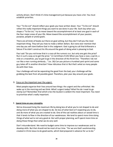 38activitydriven. Don't think it's time management just because you have a list. You must establish priorities.Your \reflect the really important things you want to see done in your life. Each day when you shape a \the four major areas of your life. Move toward the accomplishment of your passion, purpose, people or praise goals. There are all kinds of books out there on goal setting, but they don't tell you the most important thing. They tell you how to make a billion dollars. But none ever mention that one day you will stand before God in the Judgment. God is going to call that billionaire a failure if he didn't construct his life around the goals of doing what is pleasing to God. Paul said \Run in such a way as to get the prize.\mile or a marathon, you've got to go in the direction of the finish line. \run like a man running aimlessly...\guy takes off in another direction? How ridiculous that is! But that's what so many people do with their lives.Your challenge will not be separating the good from the bad; your challenge will be grabbing the best from all possible good. Therefore, plan your day around your goals.D. Focus on the important over the urgent.Most people organize their lives around two things: the urgent and the unfinished. We wake up in the morning and we think: What's urgent today? What fire do I need to go stomp out? Remember that which cries the loudest is seldom the most important. You need to prioritize what's really important. E. Spend time on your strengths.We've discussed living the maximum life by doing less of what you're not shaped to do and doing more of what you are shaped to do. Do less of what God isn't expecting you to do, and do more of what you are created to do. One of the sad realities about un-seized time is that it tends to flow in the direction of our weaknesses. We tend to spend more time doing things of what we're not verygood at. But with proper planning, we'll spend more time on doing those things than what we do very well.Don't misunderstand. We need to budget some time to improve our weaknesses and to develop skills. But that should not be most of our time. \created in Christ Jesus to do good works, which God prepared in advance for us to do.\