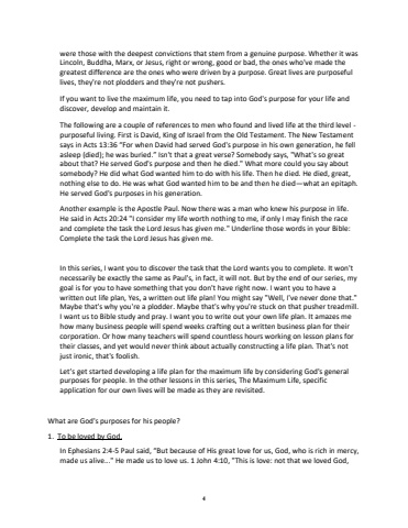 4were those with the deepest convictions that stem from a genuine purpose. Whether it was Lincoln, Buddha, Marx, or Jesus, right or wrong, good or bad, the ones who've made the greatest difference are the ones who were driven by a purpose. Great lives are purposeful lives, they're not plodders and they're not pushers.If you want to live the maximum life, you need to tap into God's purpose for your life and discover, develop and maintain it. The following are a couple of references to men who found and lived life at the third level -purposeful living. First is David, King of Israel from the Old Testament. The New Testament says in Acts 13:36 %u201cFor when David had served God's purpose in his owngeneration, he fell asleep (died); he was buried.%u201d Isn't that a great verse? Somebody says, \about that? He served God's purpose and then he died.\somebody? He did what God wanted him to do with his life. Then he died. He died, great, nothing else to do. He was what God wanted him to be and then he died%u2014what an epitaph. He served God's purposes in his generation.Another example is the Apostle Paul. Now there was a man who knew his purpose in life. He said in Acts 20:24 \and complete the task the Lord Jesus has given me.\Complete the task the Lord Jesus has given me.In this series, I want you to discover the task that the Lord wants you to complete. It won't necessarily be exactly the same as Paul's, in fact, it will not. But by the end of our series, my goal is for you to have something that you don't have right now.I want you to have a written out life plan, Yes, a written out life plan! You might say \Maybe that's why you're a plodder. Maybe that's why you're stuck on that pusher treadmill. I want us to Bible study and pray. I want you to write out your own life plan. It amazes me how many business people will spend weeks crafting out a written business plan for their corporation. Or how many teachers will spend countless hours working on lesson plans for their classes, and yet would never think about actually constructing a life plan. That's not just ironic, that's foolish.Let%u2019s get started developing a life plan for the maximum life by considering God's general purposes for people. In the other lessons in this series, The Maximum Life, specific application for our own lives will be made as they are revisited.What are God's purposes for his people? 1. To be loved by God.In Ephesians 2:4-5 Paul said, %u201cBut because of His great love for us, God, who is rich in mercy, made us alive...\