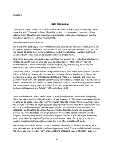 41Chapter 7 Right Relationships\ quality of your life will be in direct proportion to the quality of your relationships.\mark that well, \relationships.\mission, or you'll never live that maximum life.You need models to motivate you.Modeling is the best way to learn. Whether you are learning how to tie your shoes, drive a car, or operate a personal computer. We learn faster and better through examples. Don't just tell me how to do it also show me how. Whatever the learning objective, you learn faster and easier and with fewer mistakes as long as you have a proper model.Now in the same way, the quickest way to achieve your goals in life is to find somebody who is already doing with their life what you want to do and copy it%u2014that's the key. You find somebody who is already where you want to be spiritually, intellectually, financially and relationally; look at what he is doing and model after it.This is very biblical. The apostle Paul recognized his role as a life model when he said \others in following my example, brothers, and take note of those who live according to the pattern that we gave you.\pattern I've set forth.\model. %u201cYou became imitators of us and of the Lord; in spite of severe suffering, you welcomed the message with the joy given by the Holy Spirit. And so you became a model to all the believers in Macedonia and Achaia.%u201d (1 Thessalonians 1:6-7)Jesus openly claimed to be a model. John 13, after He had washed the disciples%u2019 feet giving them that example of humility and service, He said in verse 15, '\you should do as I have done for you.'\the way you learned to do anything was by copying what you saw done. Now the problem with that is as a child you don't get to choose your models. You just model after those who are closest to you. Therefore, as a child, if you were around somebody who was a successful person, you likely developed into a high achiever. If you on the other hand were around a negative example, you probably developed a negative attitude. If you saw anger modeled in your home, don't be surprised if you've got a bad temper. Some of us grew up under very positive models and others under negative, but most of us probably with a mix. Fortunately, as an adult, we can choose our models. Therefore, as an adult, no matter what your past was, you can re-pattern and re-program your mind. Choose models that will take your life where you want it to be. I don't know what kind of student you areof history, but every