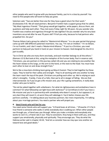 45other people who want to grow with you because frankly, you're in a class by yourself. You need to find people who will want to help you grow.Solomon said, \(Ecclesiastes 4:9) We all need partners. Benjamin Franklin had a support group that he called, \ Most Ingenious Friends.\questions and help each other. They met every Friday night for 40 years. Do you wonder why Franklin was creative and ingenious through his late eighties? Do you wonder why his very best inventions occurred after he was 70 years old? I'll tell you why, because he had partners who propelled him. Do you?Thomas Edison had a group he called his \came up with 300 different patented inventions. You say, %u201cI'm not an intellect.\I'm no Franklin, and I don%u2019t need a %u2018Mastermind Alliance.%u2019%u201d If you're a Christian, you need partners to help pull you hand in hand on your mission to heaven. God designed his church in part to edify.\ in Christ we who are many form one body, and each member belongs to all the others.\(Romans 12:5) But look at this, using the metaphor of the human body, Paul in essence said, \, you are partners in this journey called Life and you are relating to one another like the heart relates to the lungs, or the arm to the hand, or the neck to the head. You must have each other to lean on and draw strength from.\We're like a mountain-climbing team going up Mount Everest. They're tied together by those ropes. They're tied for their safety and strength. They're all working with one another to help the team reach the top of the peak. Christians are pulling each other up. We're relying on each other's strengths. Frankly, if one of us falls, then we're all in danger of falling. We are that interconnected. So if you've got a life mission and, your life is going somewhere, it really does matter who you're tied to.\ not be yoked together with unbelievers. For what do righteousness and wickedness have in common? Or what fellowship can light have with darkness?\life mission and you're in partnership with somebody who doesn't accept it, but opposes it, at very best they will resent it, at worst they will sabotage it. You%u2019d better choose your life partners carefully. I'm talking about your business partners. But more importantly, I'm talking about your marriage partners. You need a partner who will propel you.4.Need friends who will feel for you.You need some friends who will support you. \true friend is someone who walks in while everybody else is walking out. When other people see through you, a friend sees you through. When you make a mistake and everybody else wants to rub it in, a friend rubs it out. They're consistent, they hang in there with you, and they support you emotionally, physically and spiritually. They encourage you. They do what the Hebrew writer said in chapter 10:24, \toward love and good deeds.\