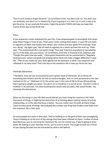 48\ in such a way as to get the prize.\run aimlessly, you don't run in mediocrity, if you're going to run, then run in such a way as to get the prize. As we conclude this series I hope the acrosticFINISH will help you keep that course all the way to the finish line. FocusIf you prepared a vision statement for your life, if you prepared goals to accomplish that vision, keep those things in front of you. That's why I stress writing them down. In your life you need to regularly sit down and review your values, your visions and your goals then evaluate %u201chow am I doing%u201d. Zig Ziglar said, \said, \you're in the faith; test yourselves.\\ the paths that you walk.\looking at your values and goals and praying about them will make a bigger difference in your life.%u201d Then as you make out your daily agenda ask the question: Is what I say important and reflected in my daily time? That's the key to the maximum life in how you finish the race. Intercept distractions\, since we are surrounded by such a great cloud of witnesses, let us throw off everything that hinders and the sin that so easily entangles, and run with perseverance the race marked out for us.\that is going to weight you down. You don't run a marathon in a suit of armor. You don't enter a triathlon in an overcoat. You shed anything that would hold you back, that would hinder. You eliminate the distractions.What are the things in your life that would distract you from living the maximum life? Well, thousands of things. It might be the distraction of a) thinking about making money; b) wrong relationships; or c) the idea that busy is better. You just clutter your life with all these things. There are thousands of things. But probably the number one thing that hinders most folks from the maximum life is their past. So many people are stuck in their past. They're holding on to the guilt of their own wrongdoing. They're holding on to the hurt of the wrongs that have been inflicted on them. If either of these described you, you're not living the maximum life. Let me remind you, if you're going to drive down life looking in your rearview mirror, you're sure to wreck. You've got to look out in front of you staying focused and not distracted by what is left behind.