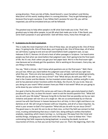 8wrong direction. There are lots of folks, David Koresh's, Louis Farrakhan's and Shirley MacLaine's of this world, leading others in a wrong direction. They've got followings just because they've got a purpose. If you follow God's purpose for your life, youwill be respected, you will be emulated and you will be followed.The greatest way to help other people is to BE what God made you to be. That's the greatest way to help other people, to just BE what God made you to be. If like David, you serve God's purposes in your generation. God will bless many, many lives through you.4. It prepares me for God's evaluation.This is really the most important of all. One of these days, we are going to die. One of these days, I%u2019m going to die. One of these days, you're going to die. One of these days, all of what we call history is going to end and we will stand before God's judgment seat, so says Hebrews 9:26-27, Romans 14:10 and a host of other passages in Scripture. I've heard some people say that when we stand before that judgment seat, that's going to be the final exam of life. No it's not, that's when you get your test paper back. We're in the final exam right now because we've already got the questions. We're working on the answers. Every day, we are filling in the blanks.You say, %u201cWait a minute, I don%u2019t know what questions are on the final exam.%u201d Well, there are just two. When you stand before the judgment seat of God, I will tell you right now what they are. There are only two questions. They are, paraphrased and stated generically, %u201cWhat did you do with my son Jesus Christ?%u201d And %u201cWhat did you do with your life?%u201d Our God is the Creator and the Master. He has invested certain talents, abilities and gifts in you and he has planned certain functions within the Body, the Church, for you to do. How are you doing on your exam? What answers have you filled in last week? What are you going to write down by your actions this week?Our goal is that by the end of this series you will have a life plan, genuinely based on God's purposes for you. But, to close this lesson I want to ask the second question first. %u201cWhat did you do with your life today?%u201d Because living life to the best thatwe possibly can by our own initiative and power will not rid us of a single sin. We are so contaminated by sin that we cannot live with God forever in heaven because He is all Holy. In Him is light and there is no darkness at all. We will not go to heavenwith our iniquities, and all of us have iniquities. So, what is your answer to God%u2019s first question %u201cWhat did you do with my son Jesus Christ?%u201d The good news is, He sent His son to die on that cross, so that if by faith we connect to that cross, trusting and believing that Jesus is God's Son, being willing to confess that before anybody, repenting, which means turning; i.e., turning your life away from the trivial and worldly things, changing your worldly and sinful life saying, \culminating that faith response by being baptized, reenacting the death, burial and resurrection of Christ, so that you can be free from your sin. That's the beginning, that's the